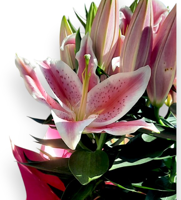 Ürün İsmi: Lila Pembe Buketli Beyaz Polimer Saksıda Pembe Lilyum